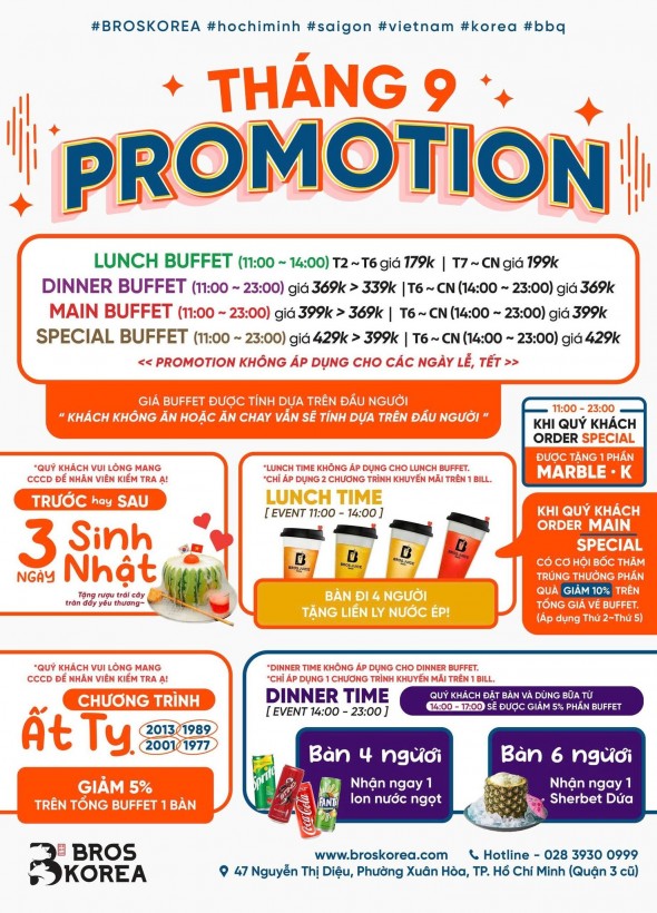9월 프로모션런치 뷔페 (11:00 ~ 14:00)월 ~ 금: 179,000 VND토 ~ 일: 199,000 VND디너 ..