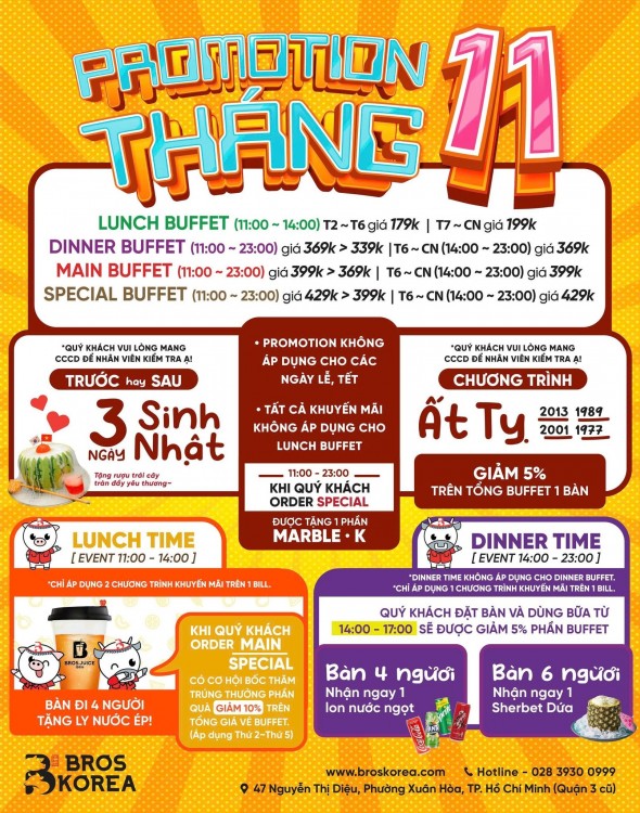 11월 프로모션런치 뷔페 (11:00 ~ 14:00)월~금: 179,000 VND토~일: 199,000 VND디너 뷔페 ..