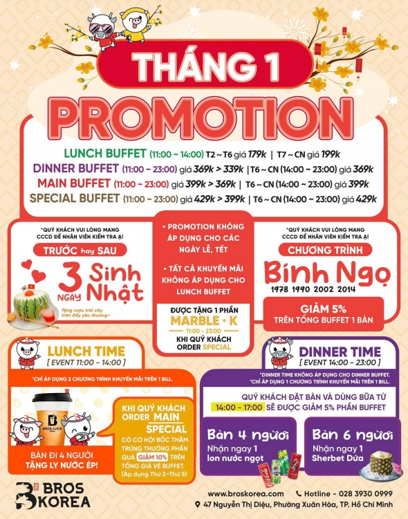 1월 프로모션 안내런치 뷔페 (11:00 ~ 14:00)월요일~금요일: 179,000 VND토요일~일요일: 199,000..